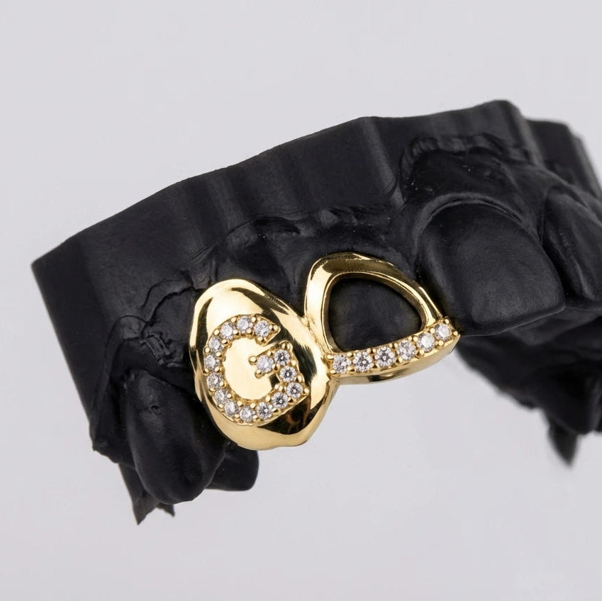 Wear your identity with pride using this fully customizable two-piece configuration. The centerpiece of this set is a high-polish solid cap on the canine, adorned with a custom initial of your choice, where the letter itself is brought to life with precision-set stones.