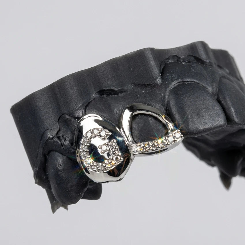 Flanking it is a sleek Open Face cap, featuring a subtle yet striking line of stones running exclusively along the bottom edge. The combination creates a sophisticated balance between bold personalization and understated luxury, ensuring your smile is truly one-of-a-kind.