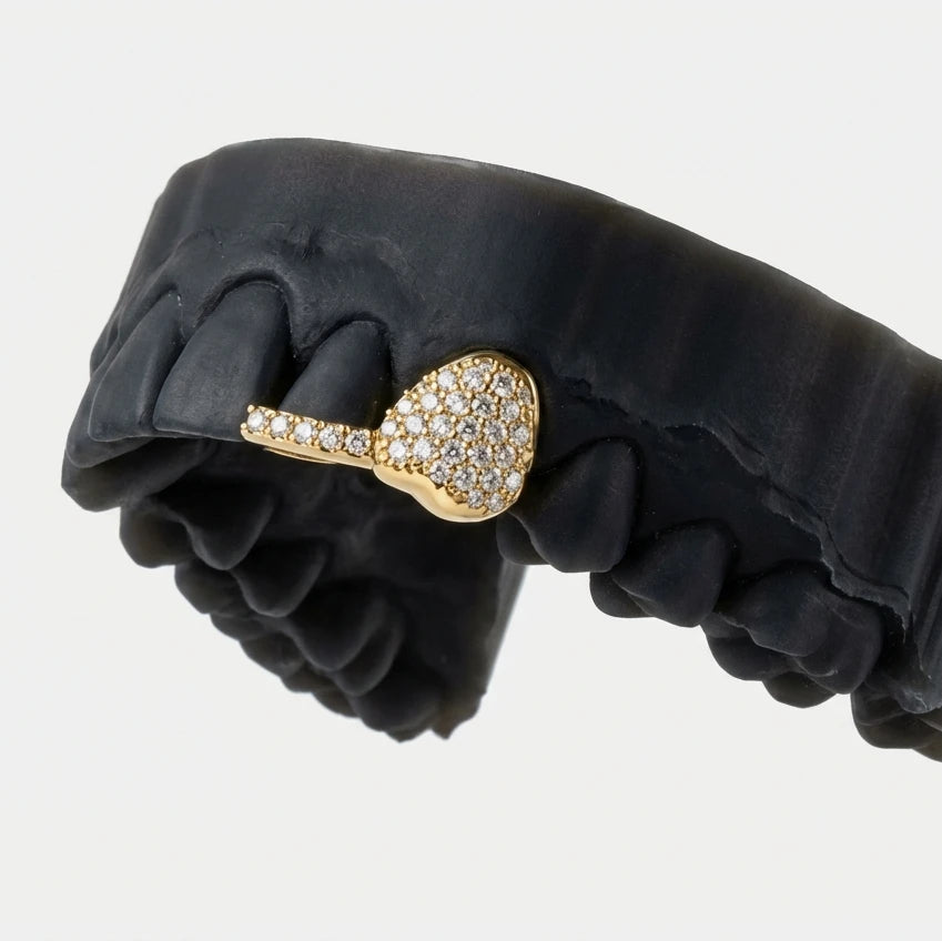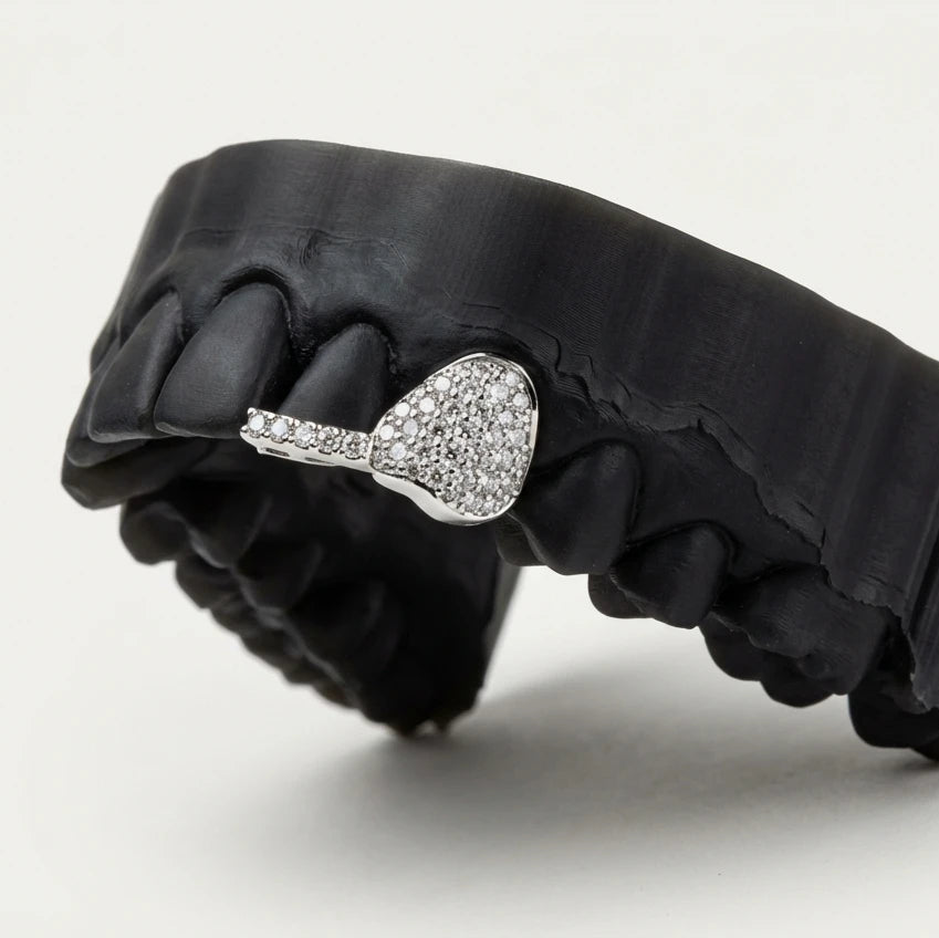 Create a striking contrast with this custom two-piece set that plays with light in two distinct ways. The centerpiece is a Fully Iced Out Cap on the canine, delivering a wall-to-wall pave setting for maximum brilliance and coverage.